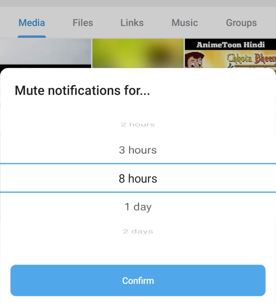 Mute chats for 1 hour, 8 hours, 2 days, or forever.
